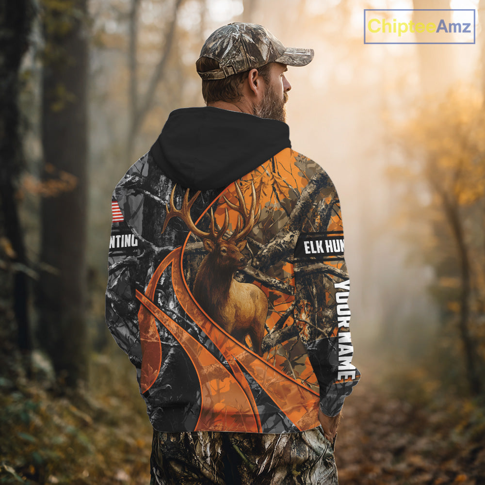 Elk Hunting Orange and Black Camo Shirts with US Flag, Personalized Hunting Shirt NBT100