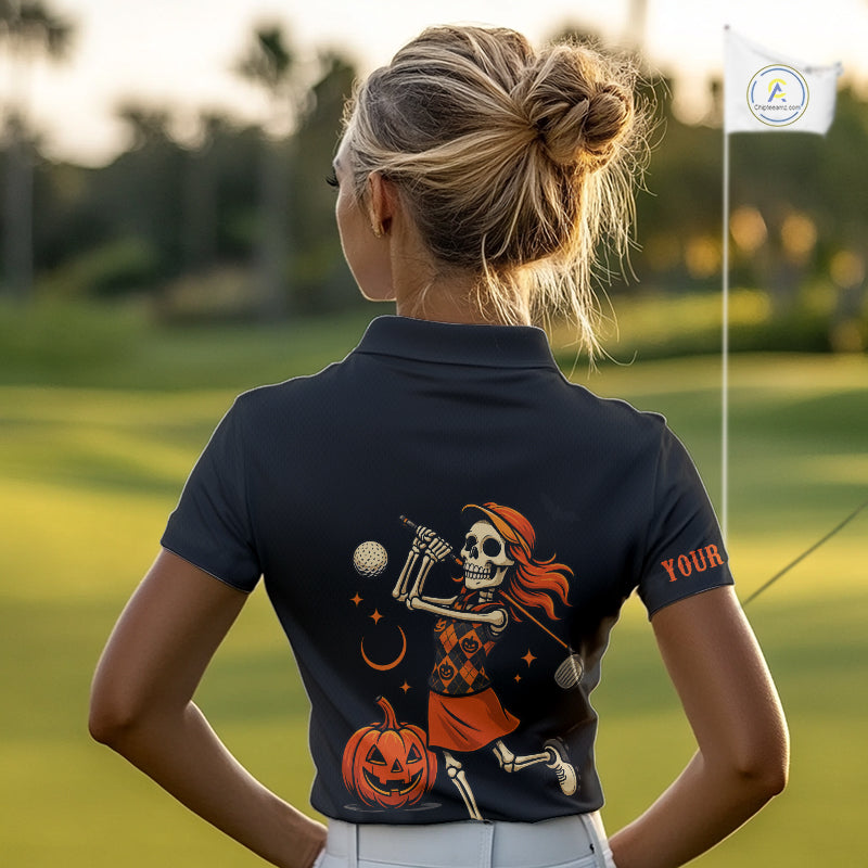 Black and Orange Skull Golf polo shirt for Women Custom Halloween Ladies golf outfit NQS10353