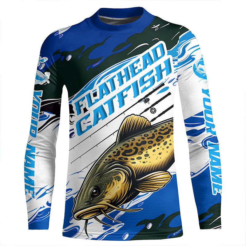 Custom Flathead Catfish Fishing Jerseys, Catfish Long Sleeve Tournament Fishing Shirts | Blue Camo IPHW6226