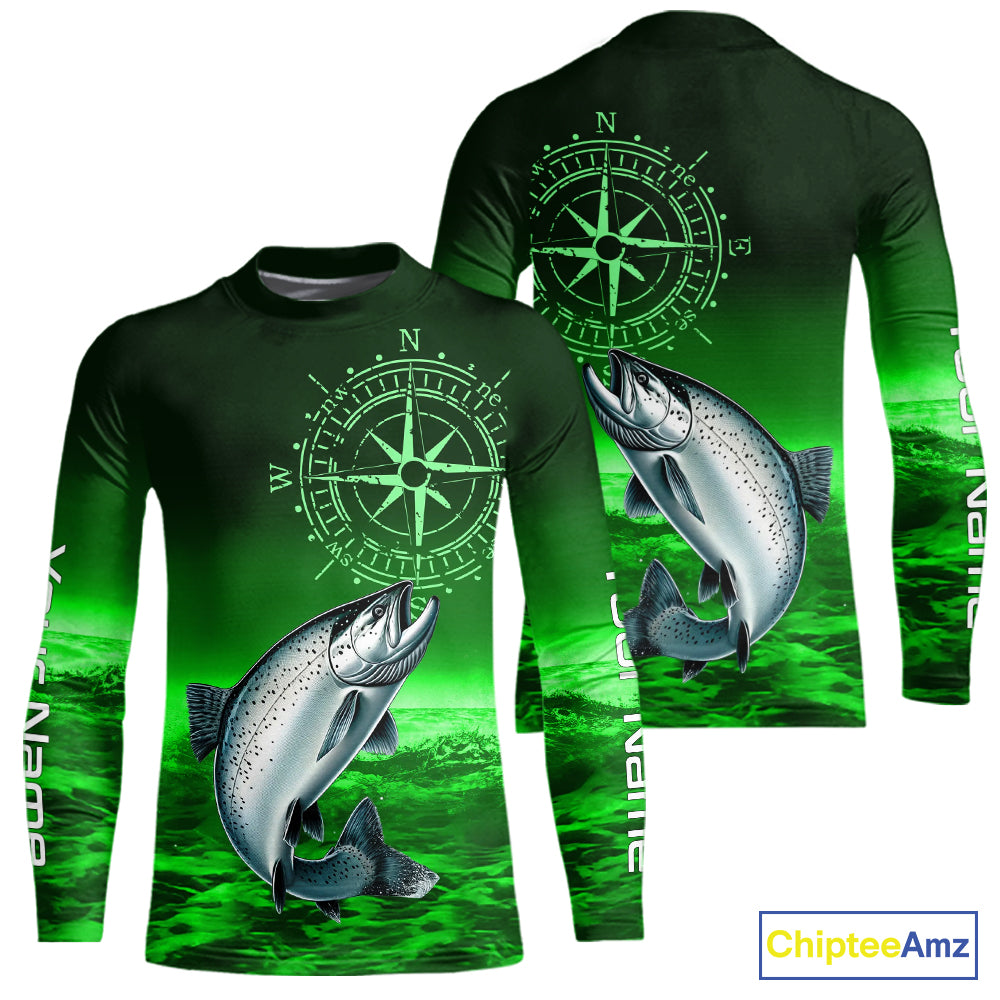 Personalized Salmon Green Performance Fishing Shirts, compass Salmon fishing tournament Shirts NQS10237