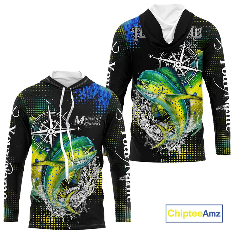 Personalized Black and Green Mahi Mahi fishing scales compass Performance long sleeve Fishing Shirts NQS11216