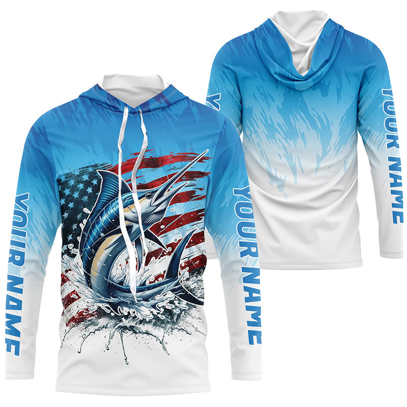 Custom Patriotic Marlin Long Sleeve Fishing Shirts, American Flag Marlin Saltwater Fishing Shirt IPHW7952