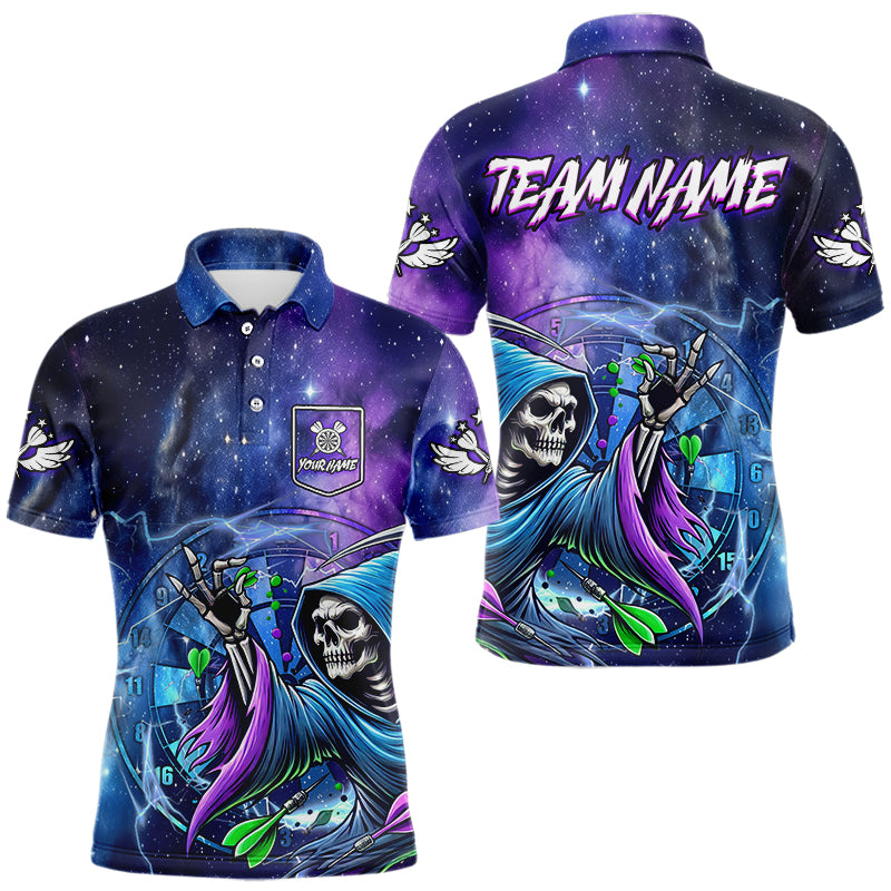 Funny Death Skeleton Blue Purple Galaxy Dart Shirts For Men Custom Glowing Dart Jerseys Outfits TDM3561