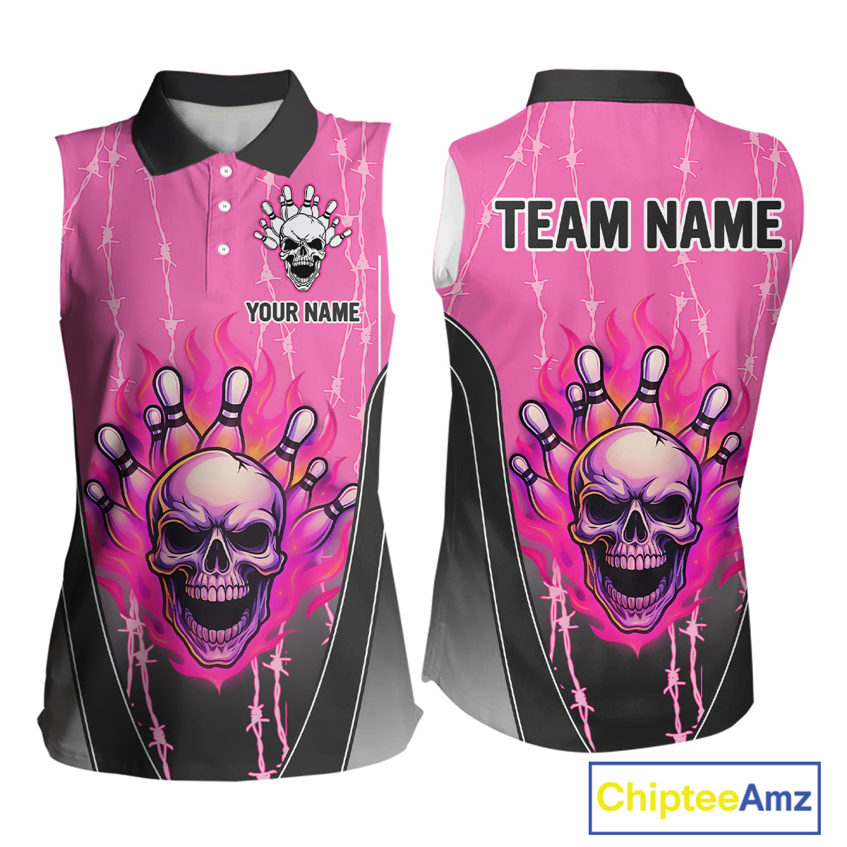 Black and pink flame skull Bowling sleeveless polo Shirt for Women Custom Team Bowling League Jersey NQS10203