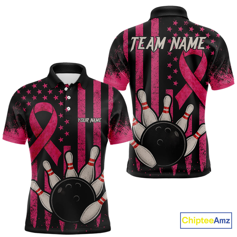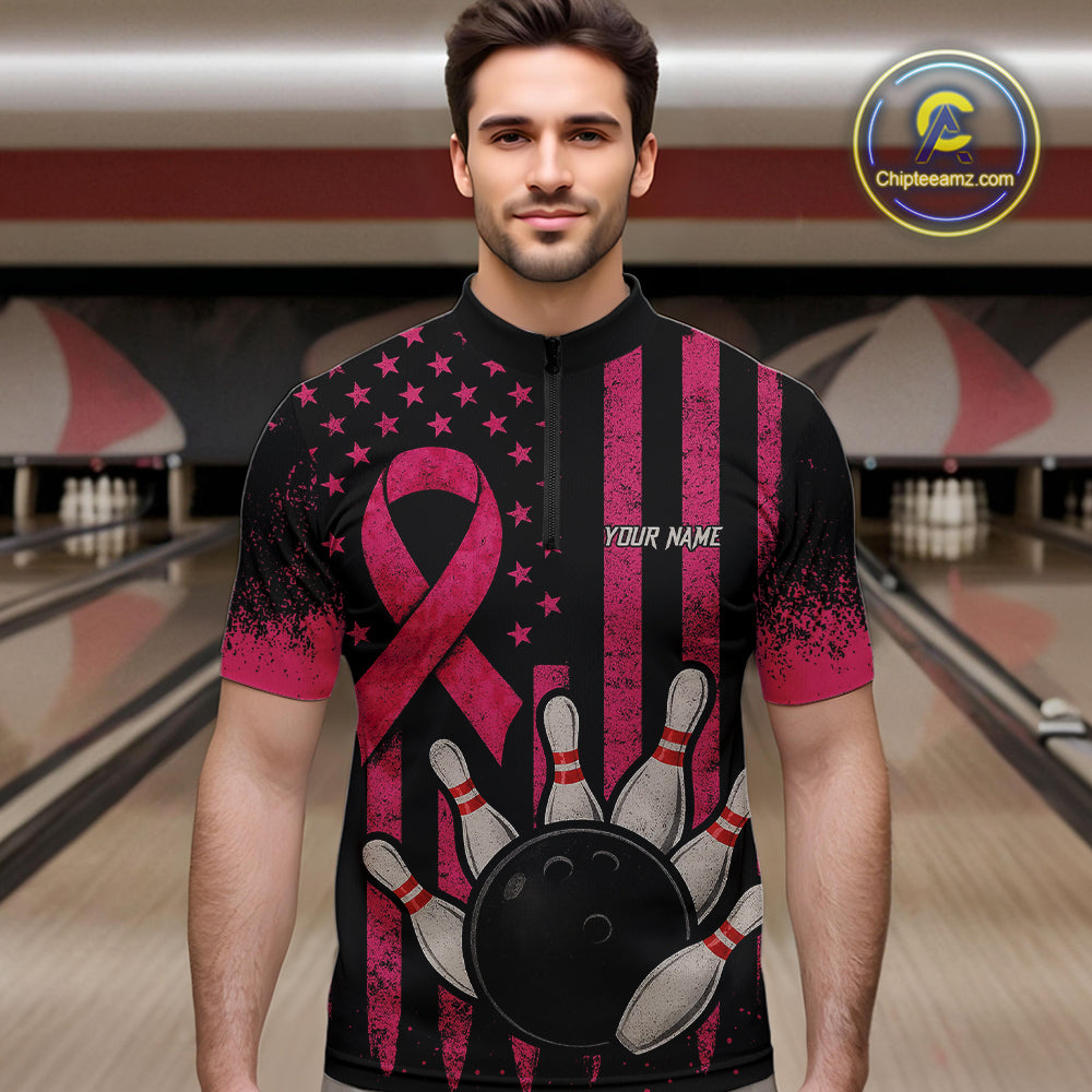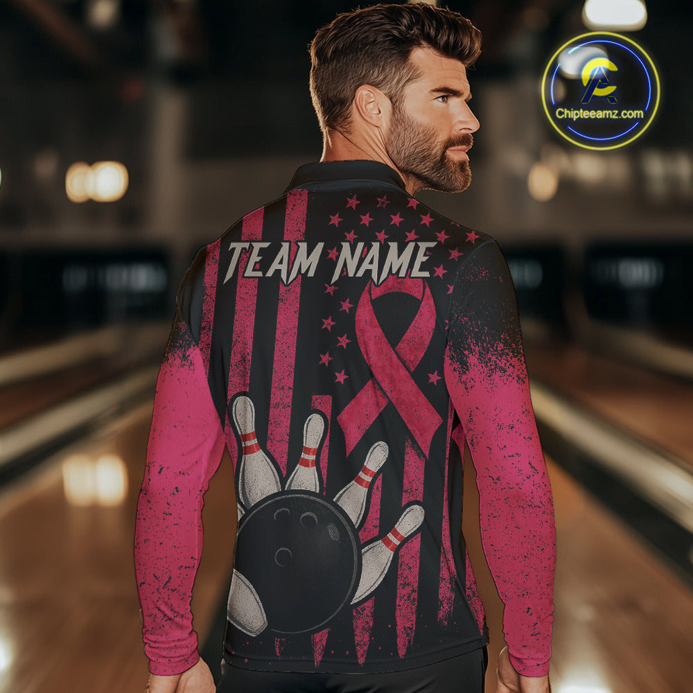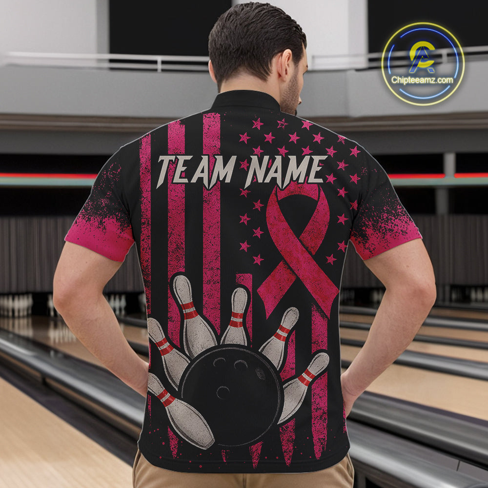 Black and Pink ribbon American Flag Breast Cancer Bowling Shirts For Men Custom Bowling Team Jerseys NQS9841