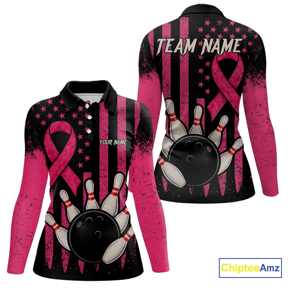 Black and Pink ribbon American Flag Breast Cancer Bowling Shirts For Women Custom Bowling Team Jerseys NQS9841
