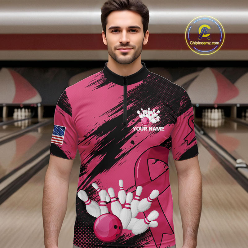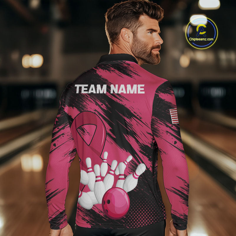 Black and Pink ribbon Bowling shirts for Men Custom breast cancer American flag bowling team jersey NQS10141