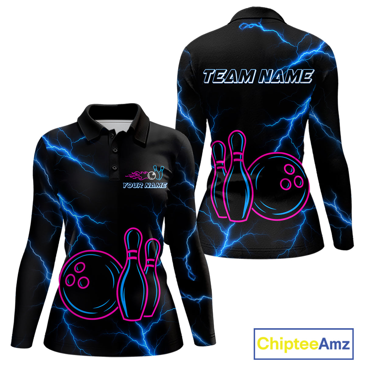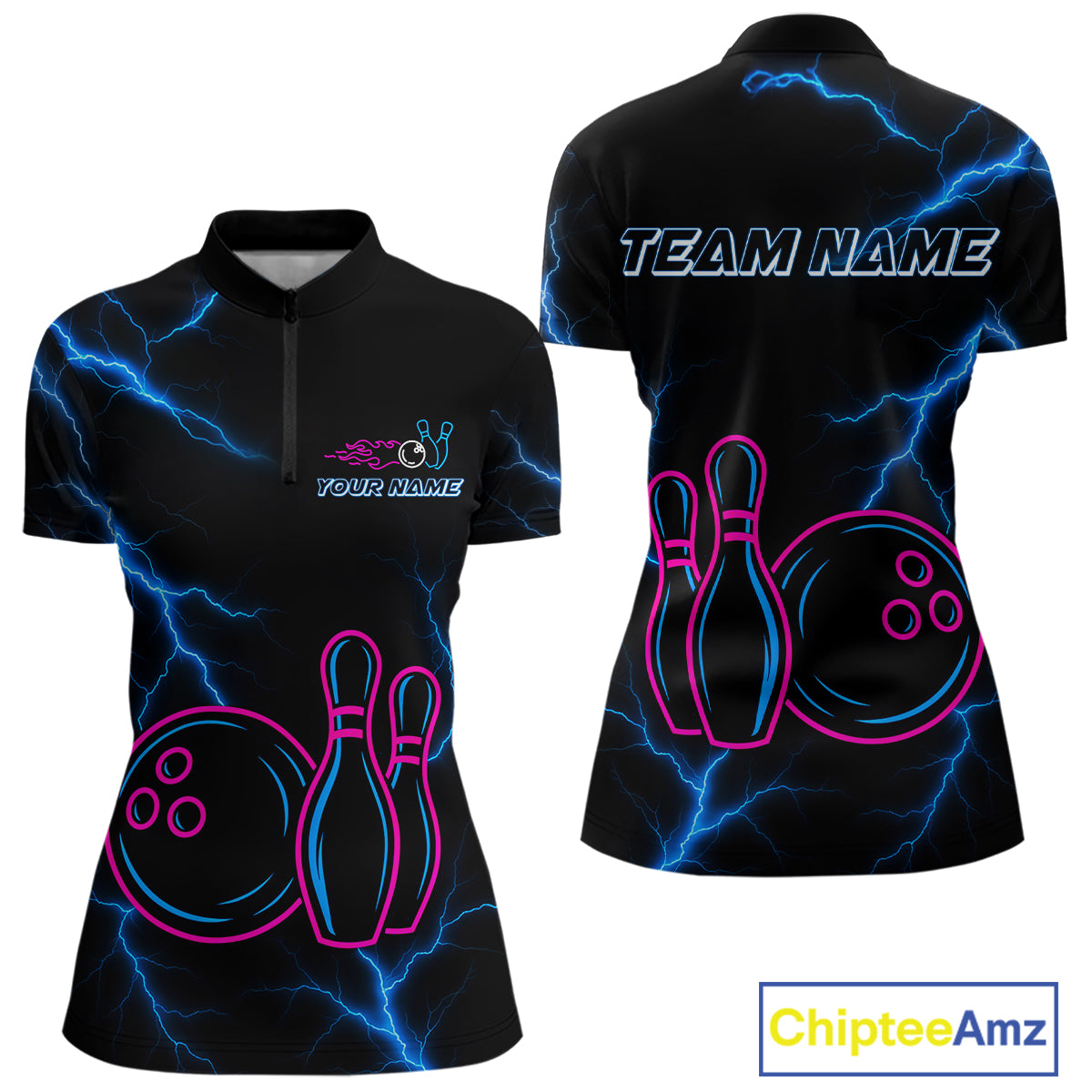Blue lightning thunder pink neon Bowling Polo, Quarter Zip Shirt For Women Custom Bowling Team Jersey NQS10181
