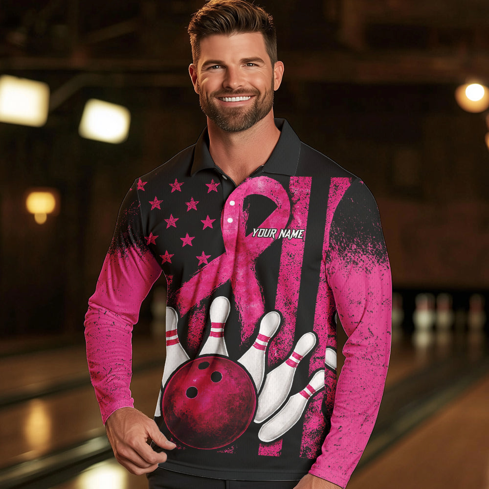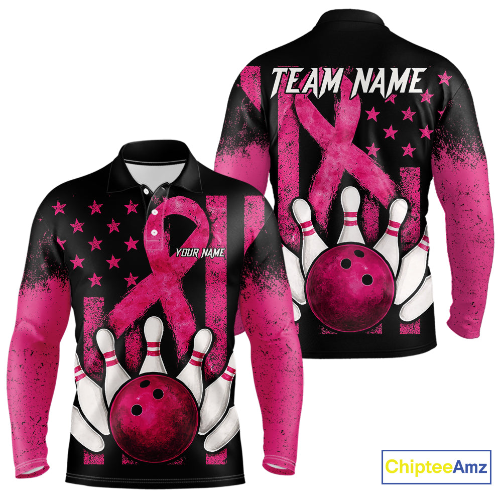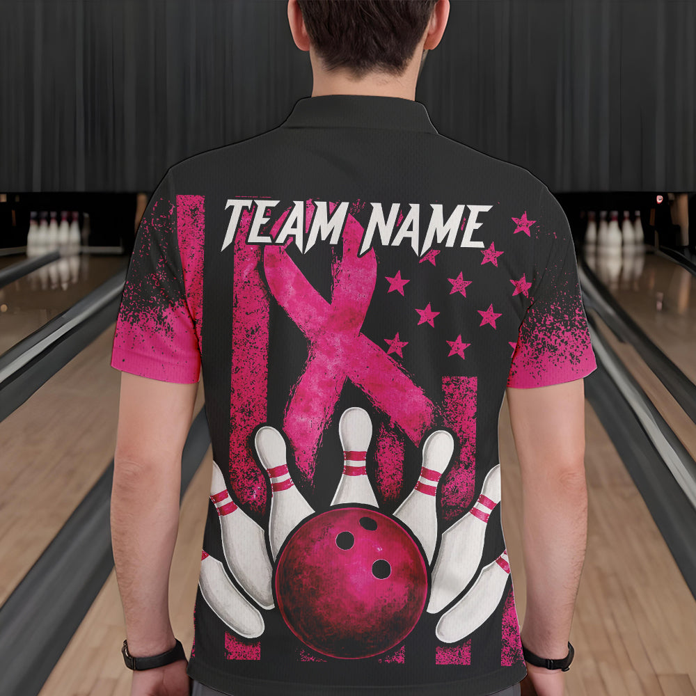 Breast Cancer Bowling Shirts For Men Custom Black and Pink ribbon American Flag Bowling Team Jerseys NQS9842