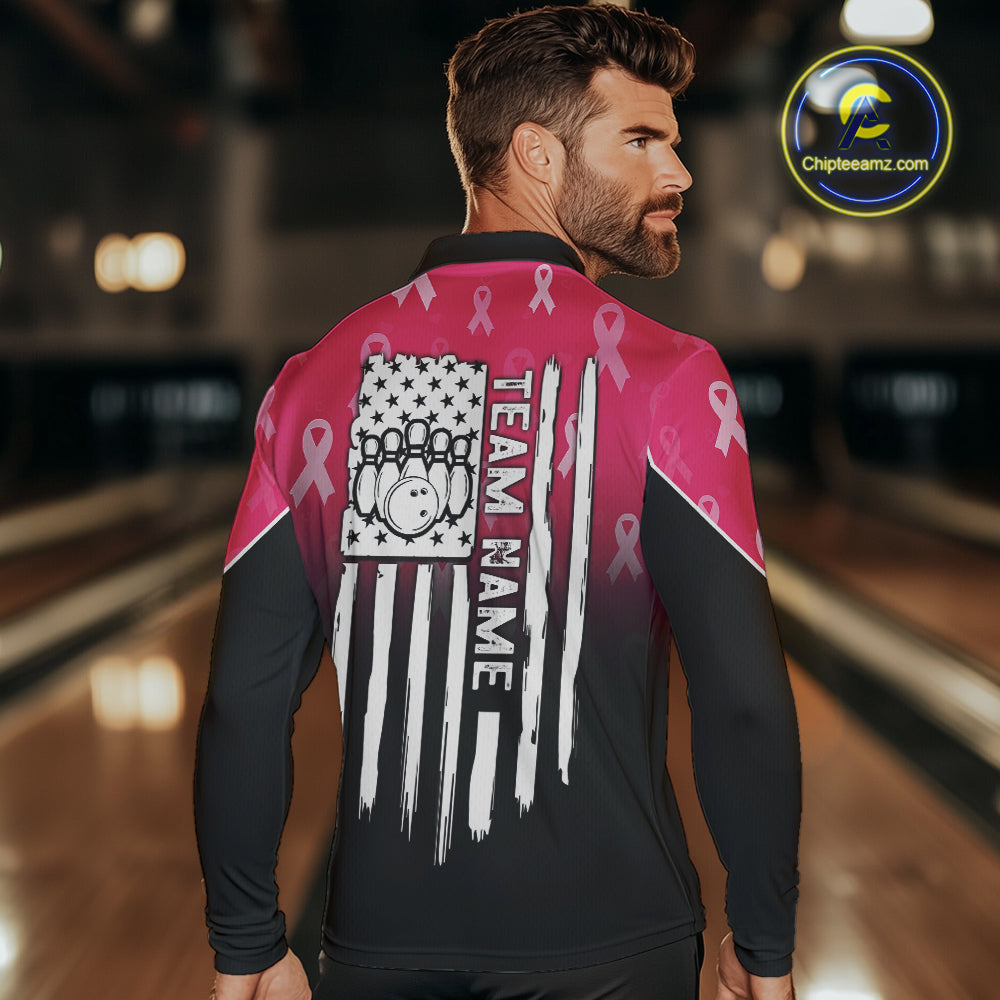 Custom American flag patriotic Pink ribbon breast cancer bowling shirt for men bowling team jersey NQS10413