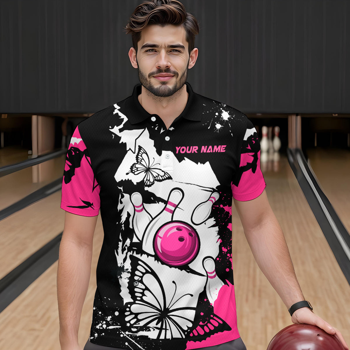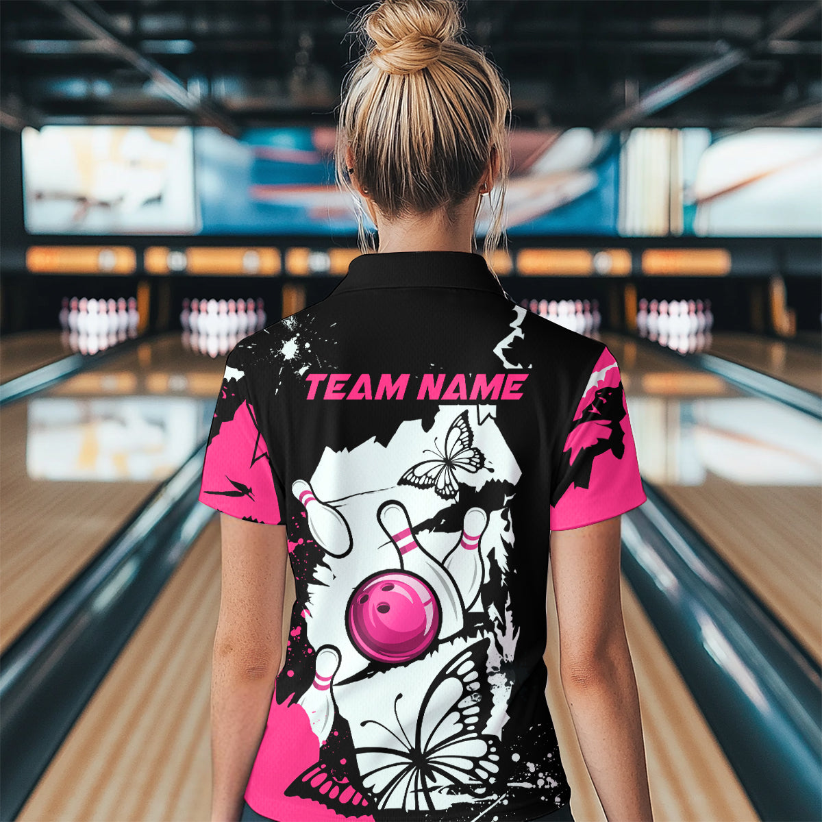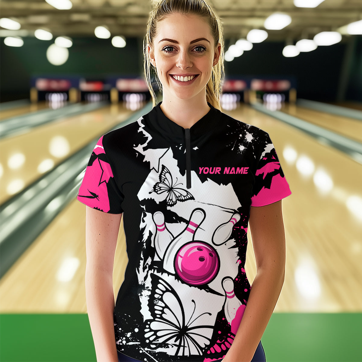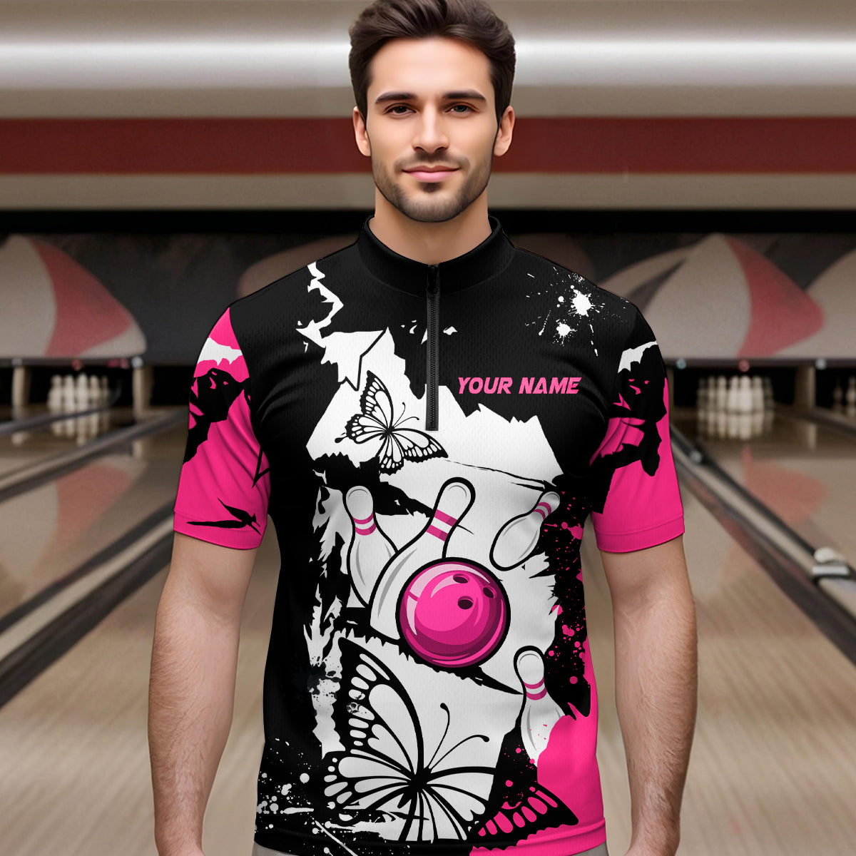 Custom Pink Butterflies Bowling Shirt for Men Women Team Bowling Polo&Quater Zip MBL76