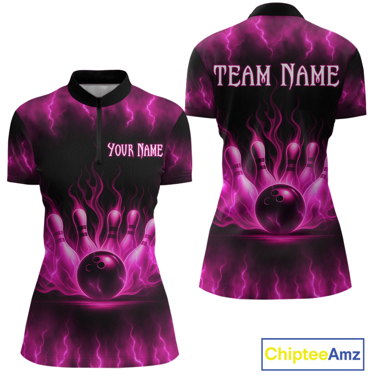 Custom Pink Flame Bowling Shirts for Women Men Team Bowling Polo and Quarter Zip MBL132