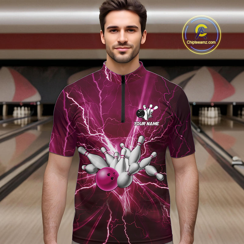 Men's Bowling Shirts Custom Pink Lightning Thunder Bowling Team Jersey, gift for team Bowlers NQS10603