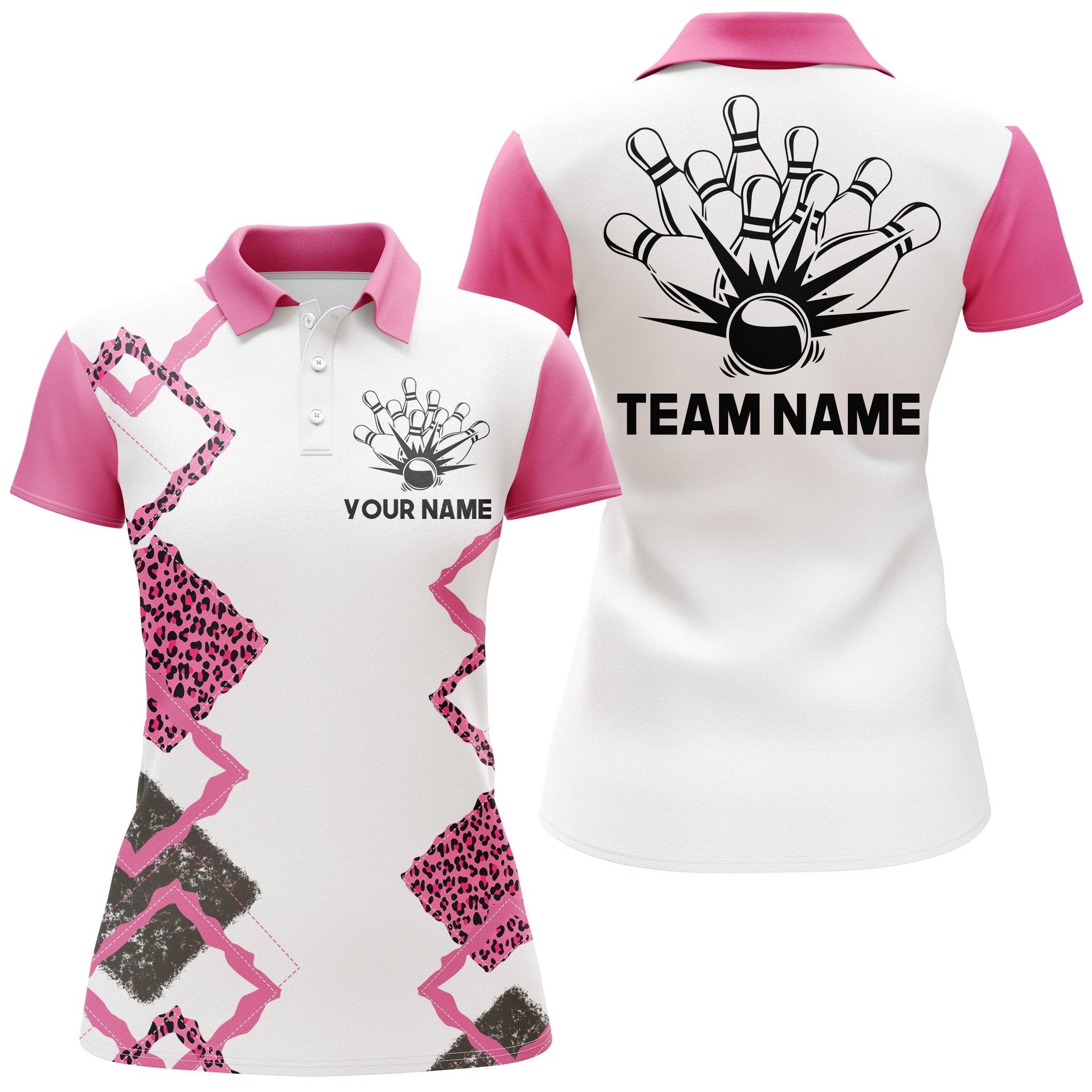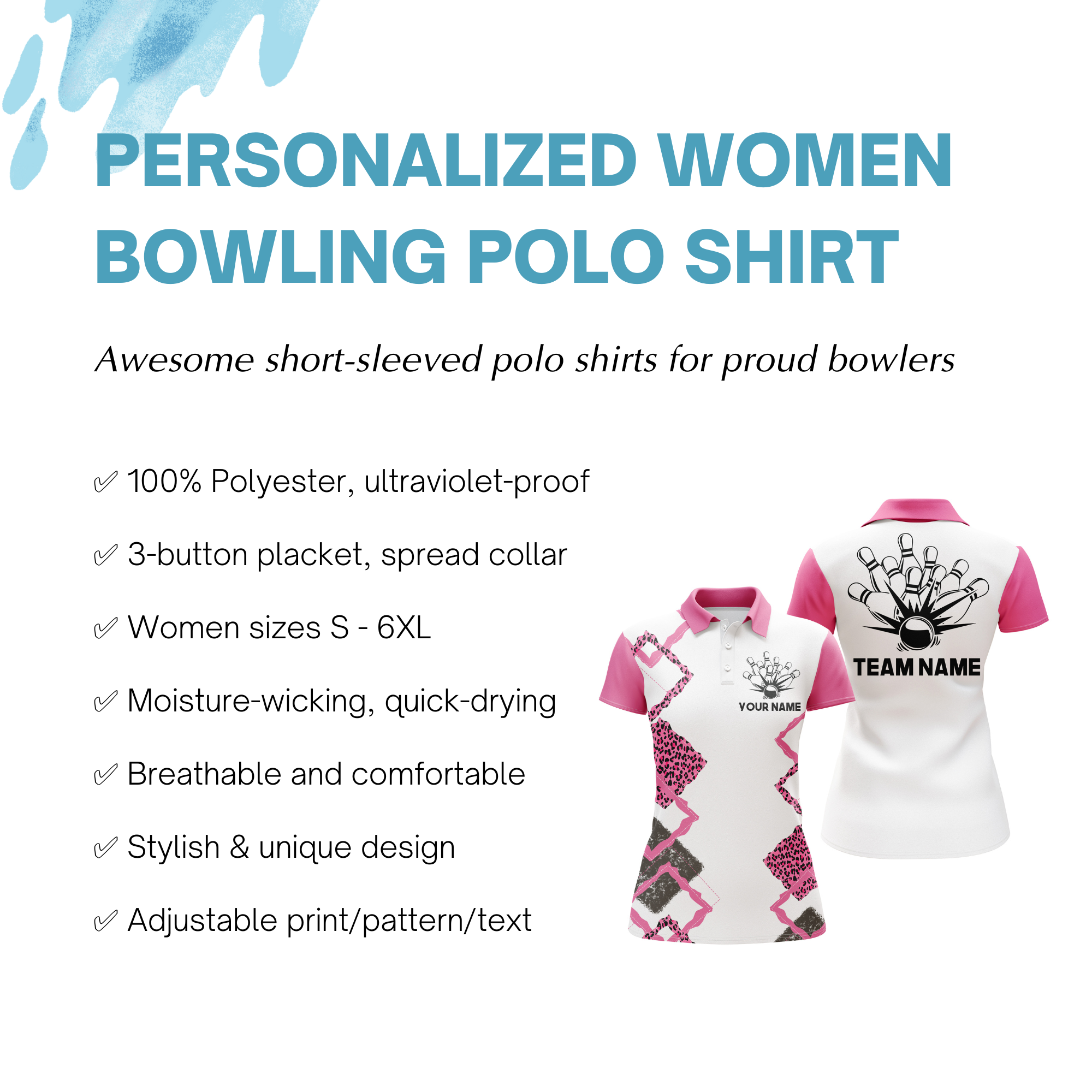 Personalized Women Polo Bowling Shirt Pink Leopard Girl Short Sleeve Team Female Bowlers Jersey NBP07