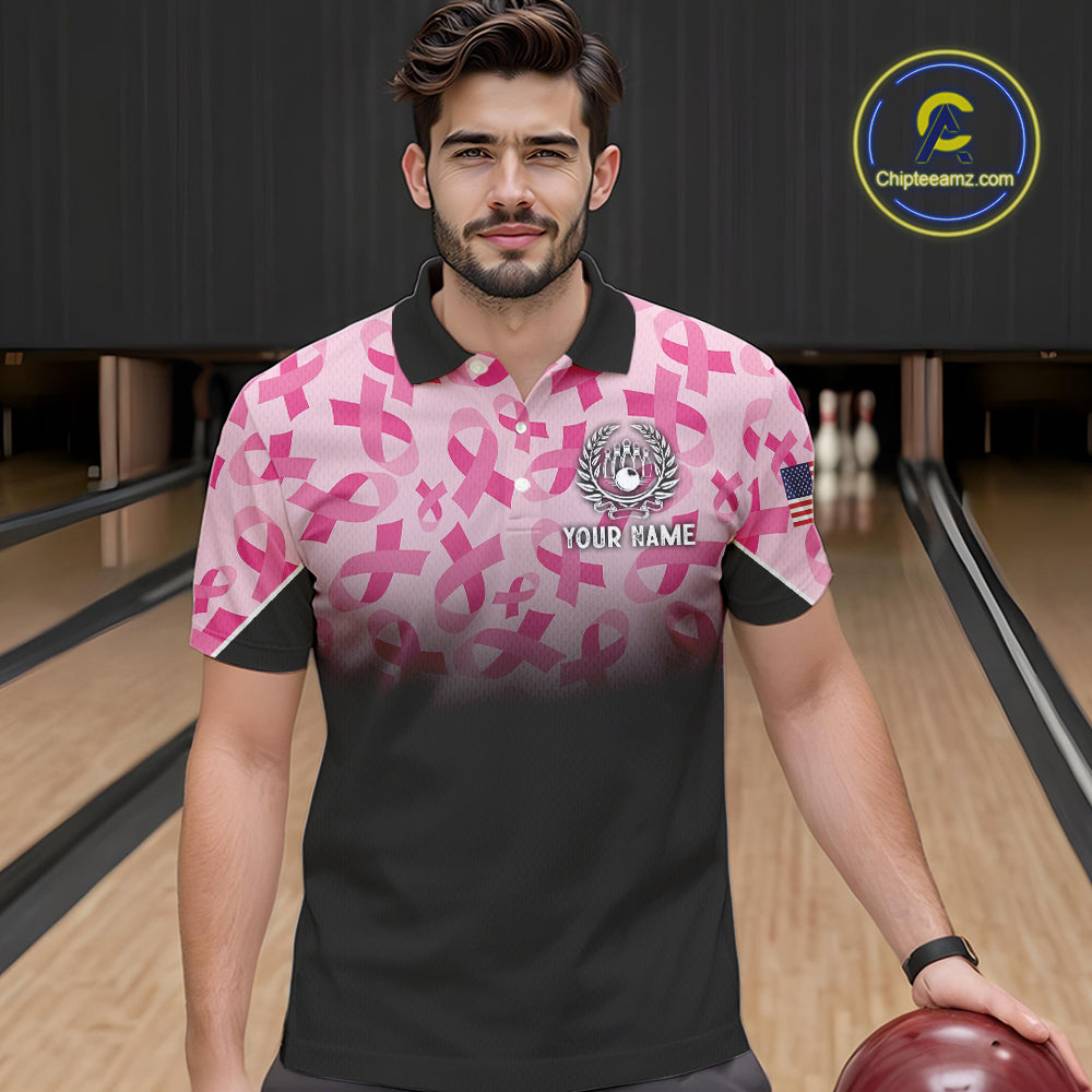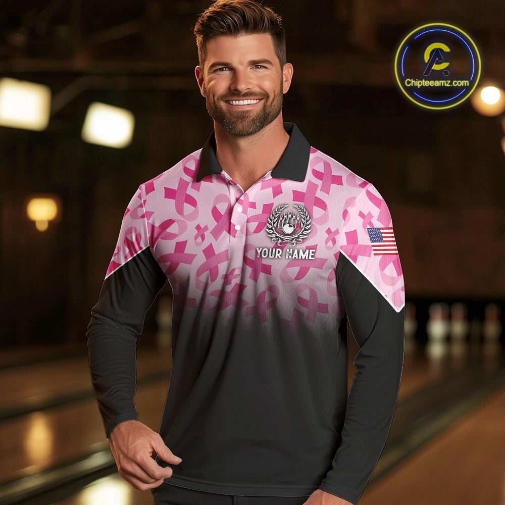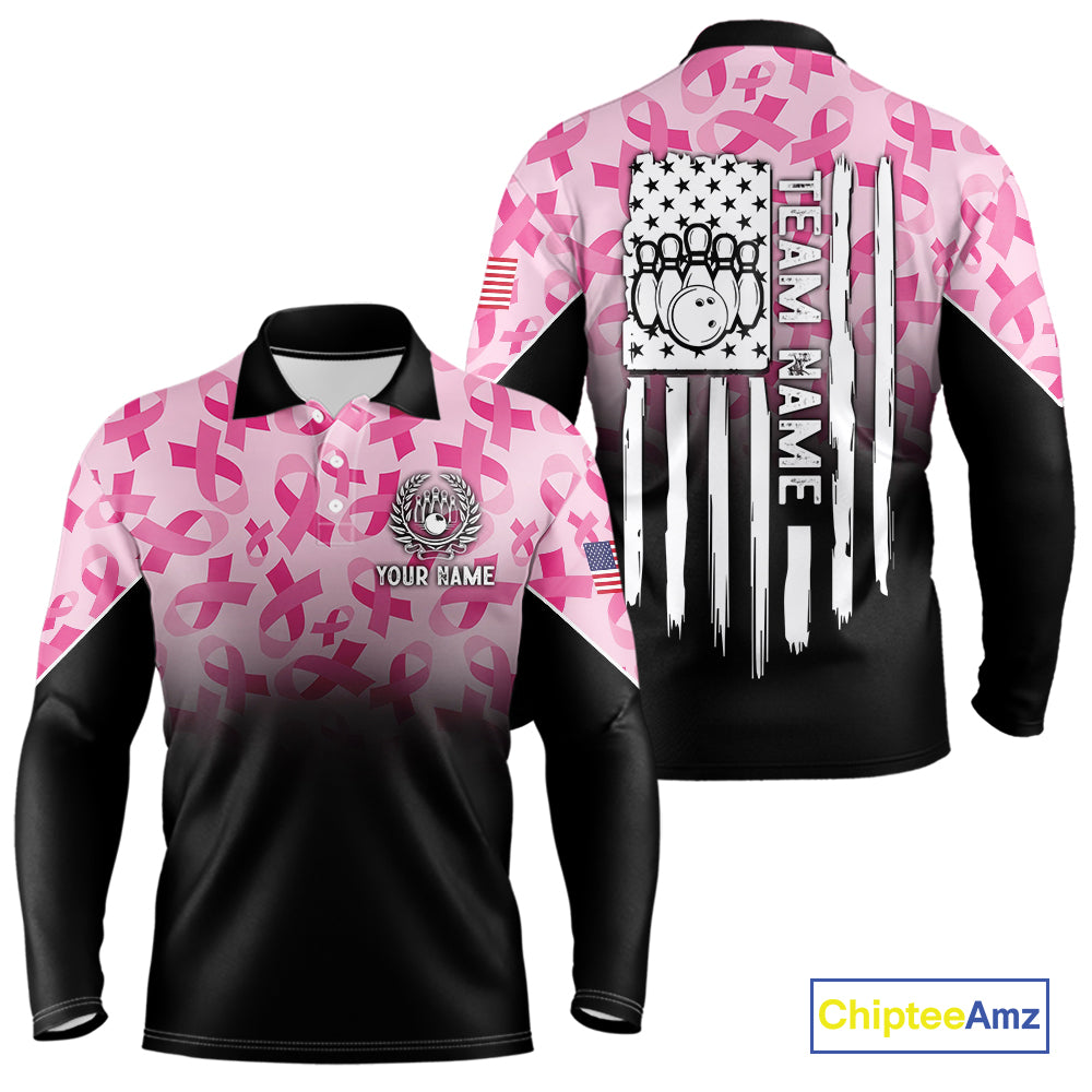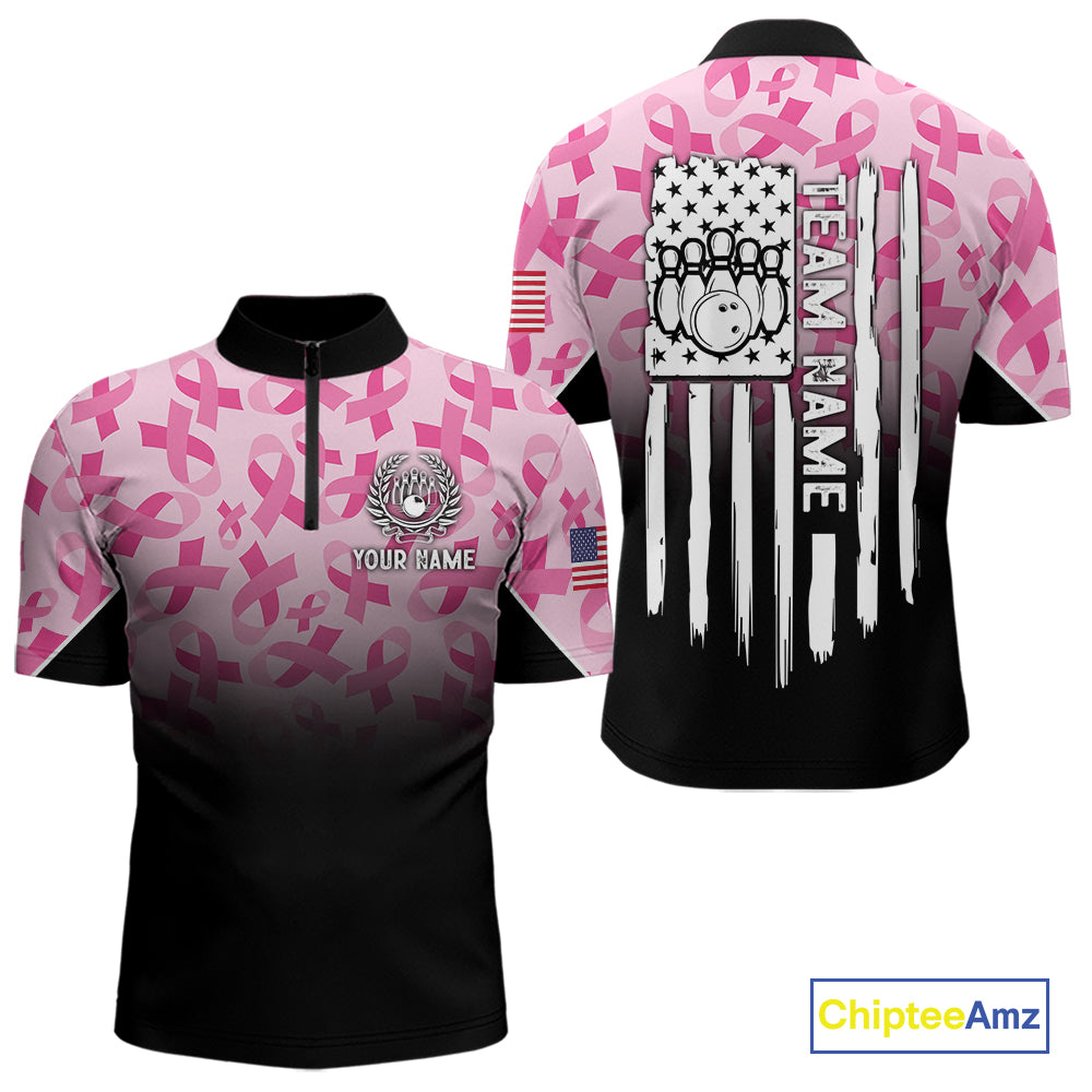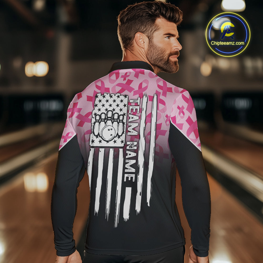Pink ribbon pattern Men bowling shirt Custom American flag patriotic breast cancer bowling team shirt NQS10411