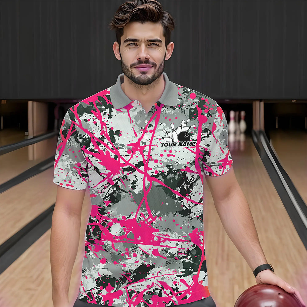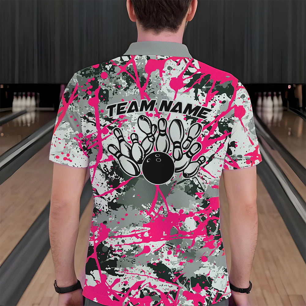 Custom Pink Splatter Bowling Team Polo Shirts For Men, Bowling Tournament Shirts IPHW8309