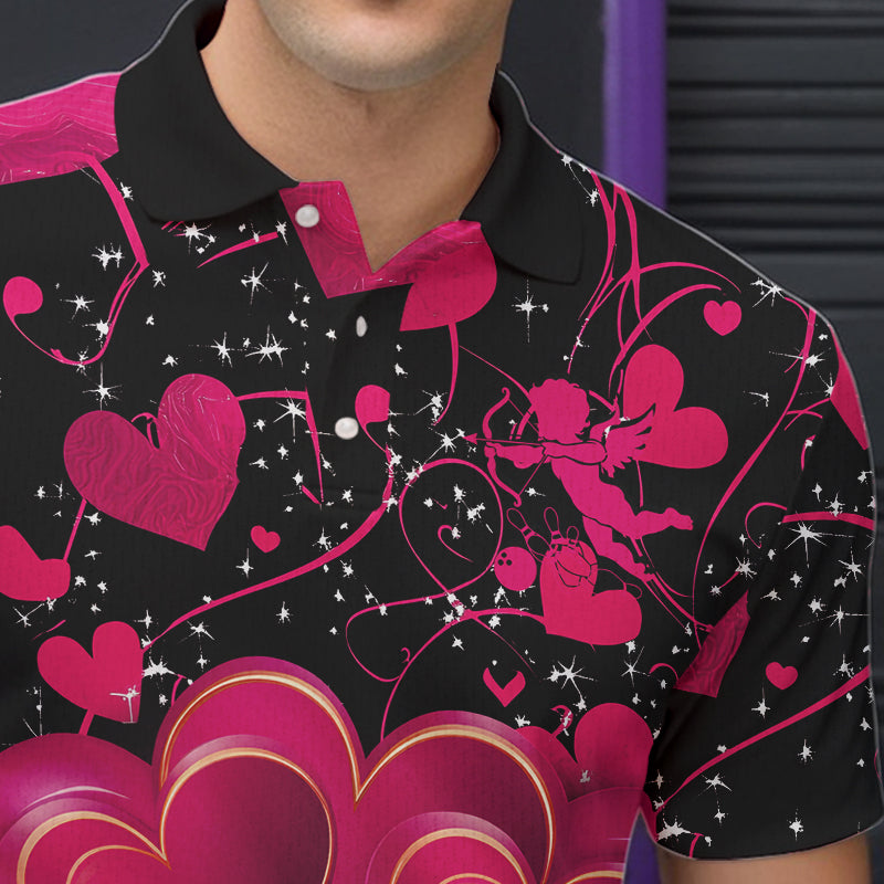 Black And Pink Custom Valentines Day Bowling Polo Shirts For Men, Bowling Couple Shirt IPHW8328