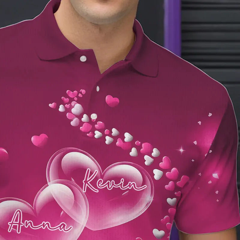 Pink Heart Theme Custom Valentines Bowling Polo Shirts For Men, Couple Bowling Shirt IPHW8347