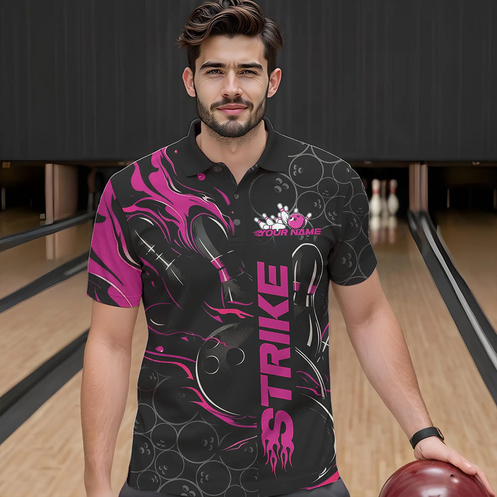 Custom Black And Pink Flame Strike Bowling Team Polo Shirts For Men, Strike Bowling Jerseys IPHW8613