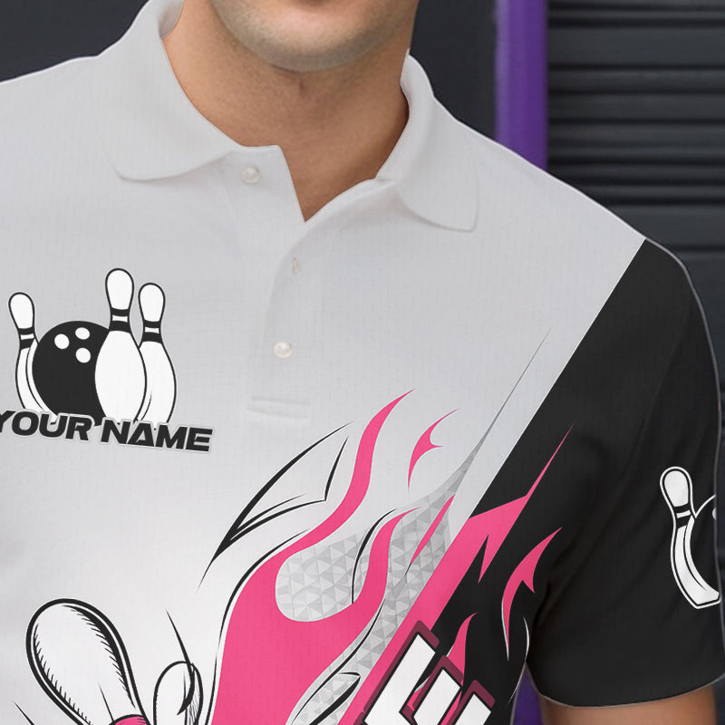 Custom Pink Flame Strike Bowling Men Polo Shirts, Bowling Team Uniform Bowling League Shirt IPHW8778
