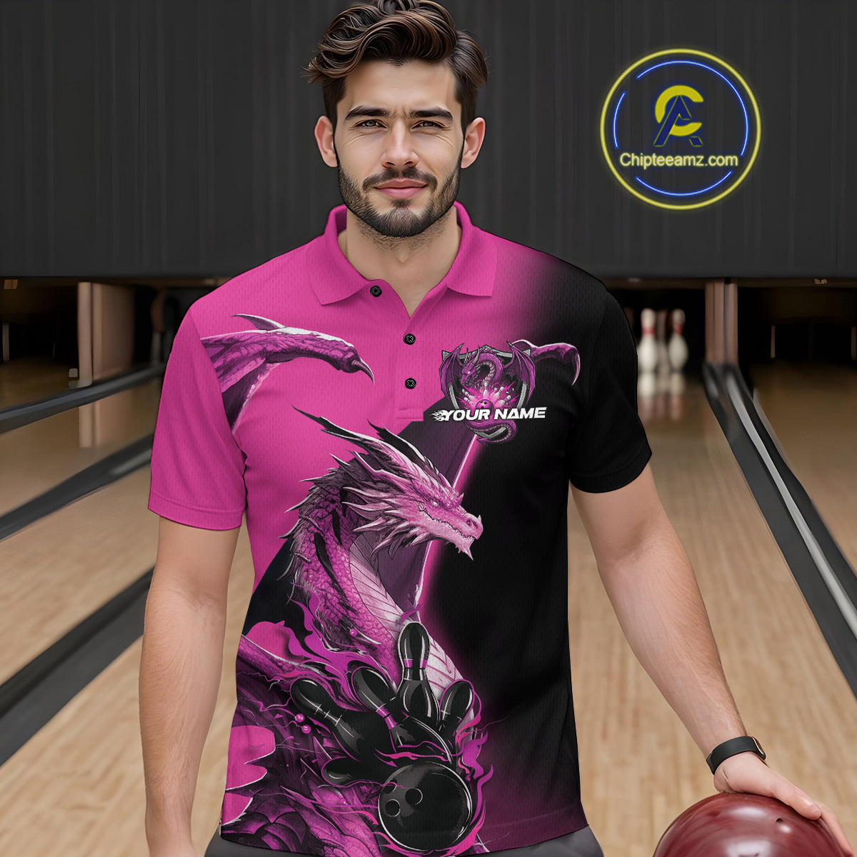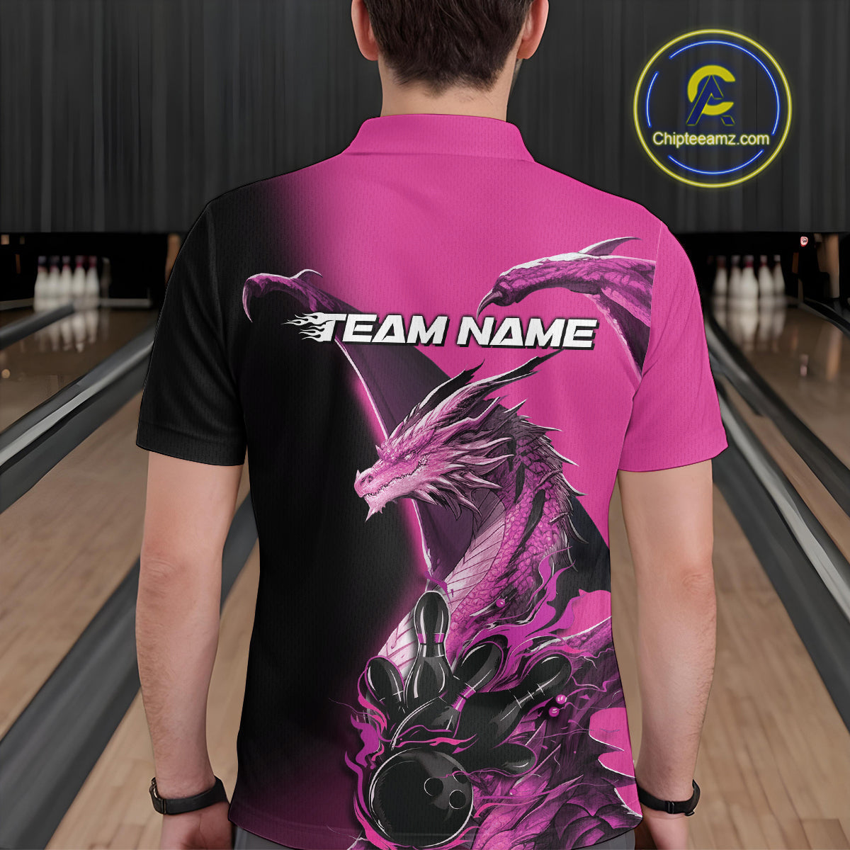 Custom Pink Dragon Flame Bowling Polo Shirts For Men, Bowling Tournament Shirt IPHW9332