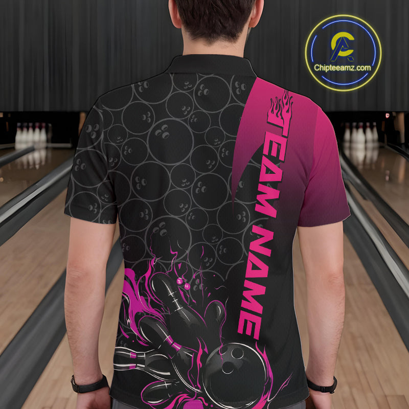 Custom Bowling Pattern Pink Flame Strike Bowling Team Men Polo Shirts, Bowling Jerseys IPHW9417