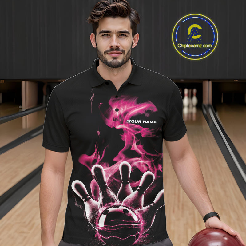 Custom Pink Smoke Bowling Polo Team Shirts For Men, Flame Bowling League Shirt IPHW9564