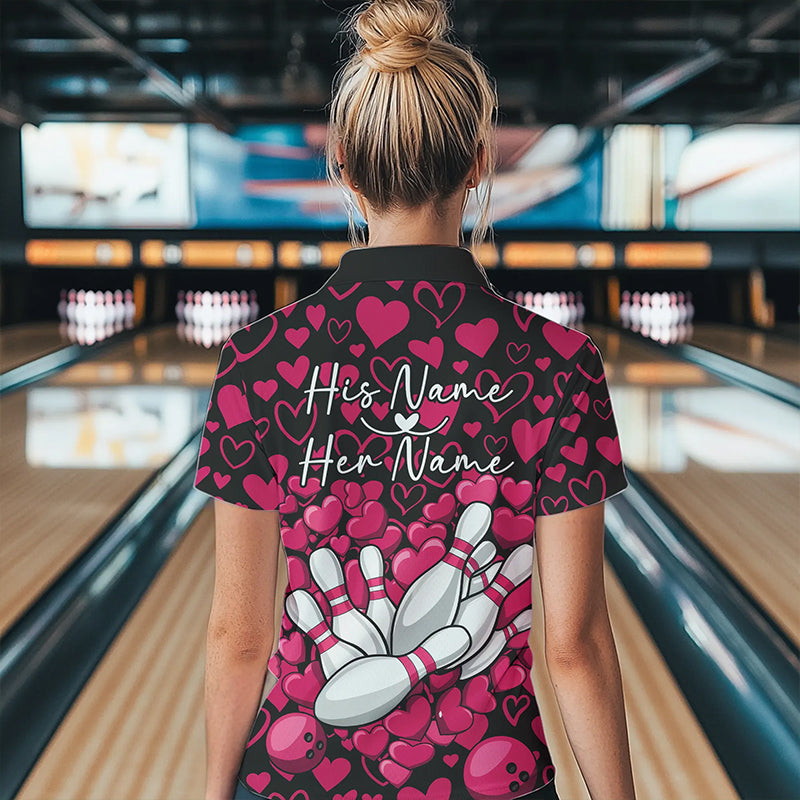 Black And Pink Heart Custom Valentines Bowling Polo Shirt For Women, Couple Bowling Shirt IPHW8337