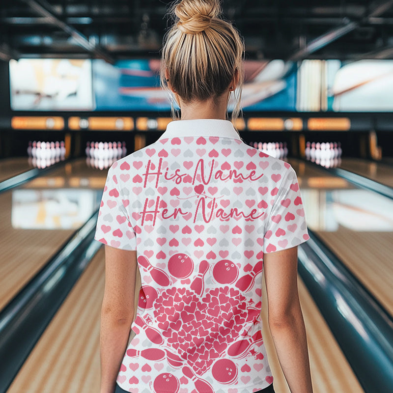 Custom White And Pink Heart Theme Valentine Bowling Polo Shirts For Women, Couple Outfit IPHW8363