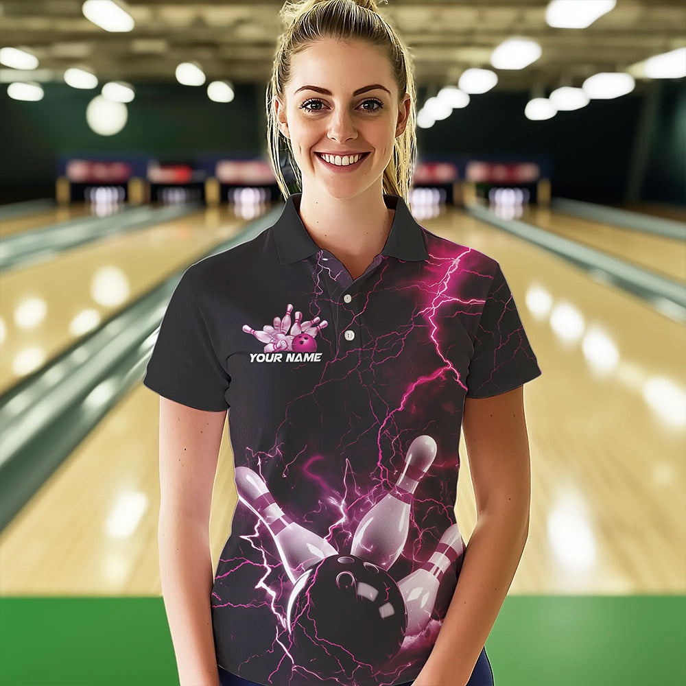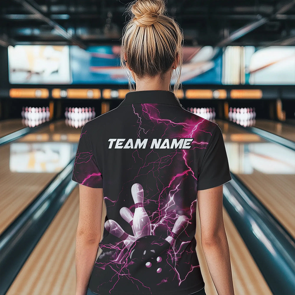 Custom Black And Pink Thunder Lightning Bowling Tournament Polo Shirts For Women IPHW8523