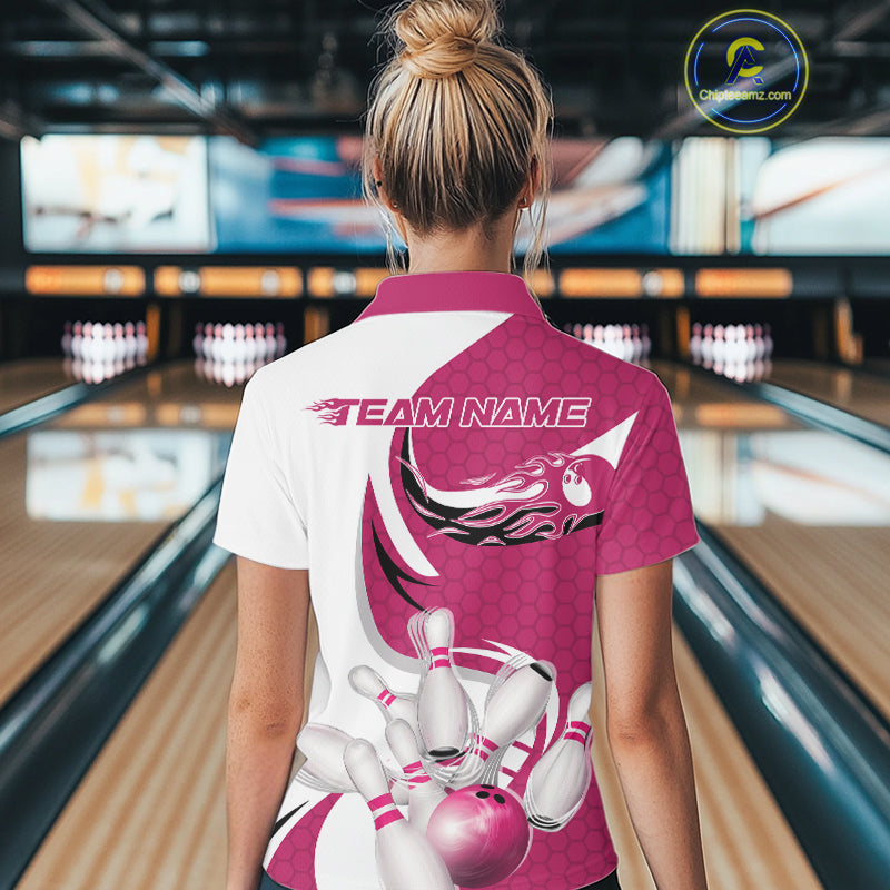 Custom White And Pink Bowling Polo Shirts For Women, Flame Bowling Team Shirt IPHW9241