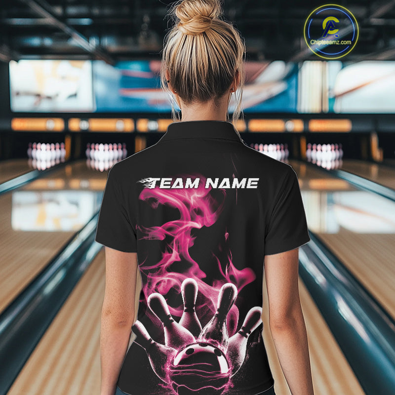 Custom Pink Smoke Bowling Polo Team Shirts For Women, Flame Bowling League Shirt IPHW9564