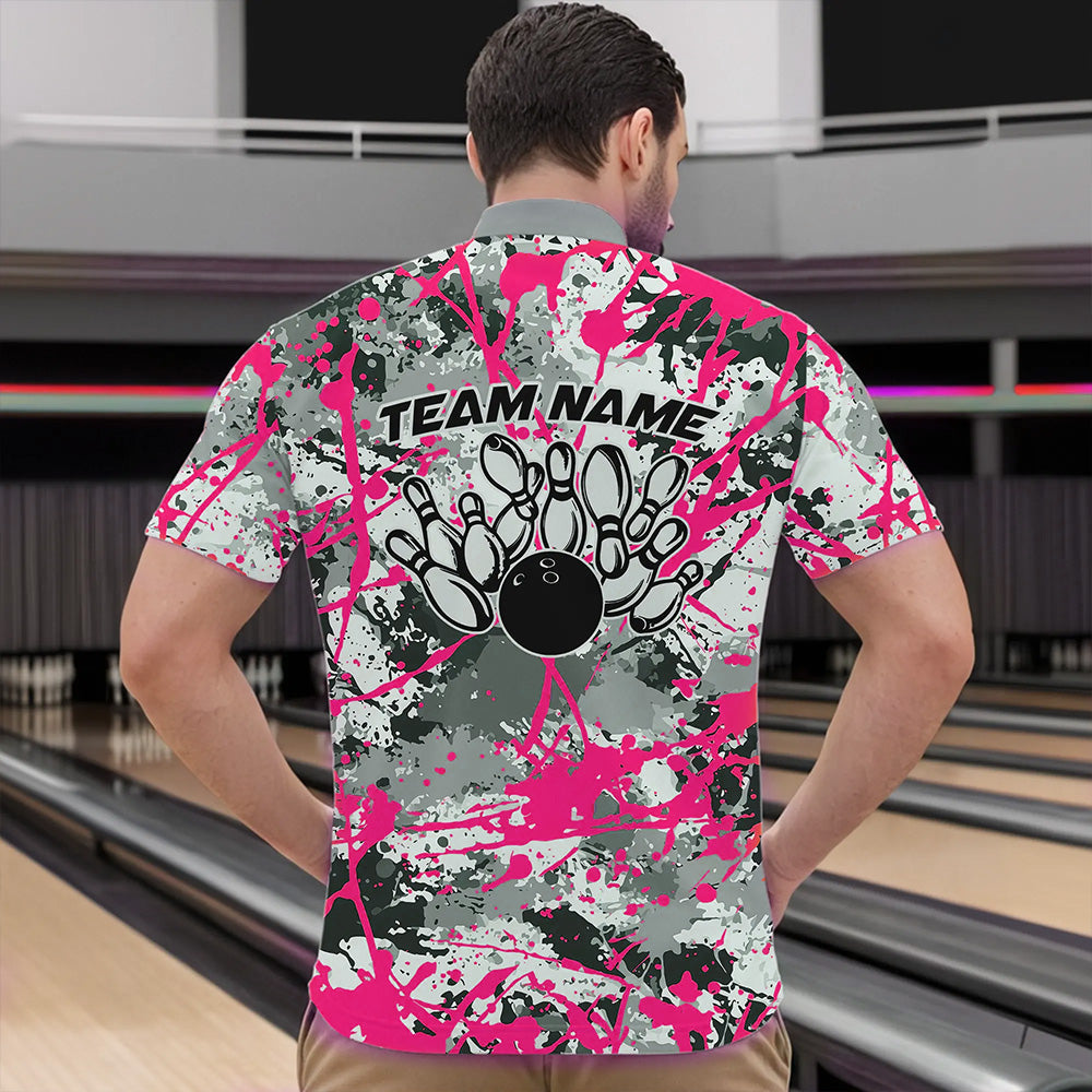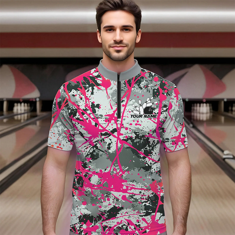 Custom Pink Splatter Bowling Team Quarter-Zip Shirts For Men, Bowling Tournament Shirts IPHW8309
