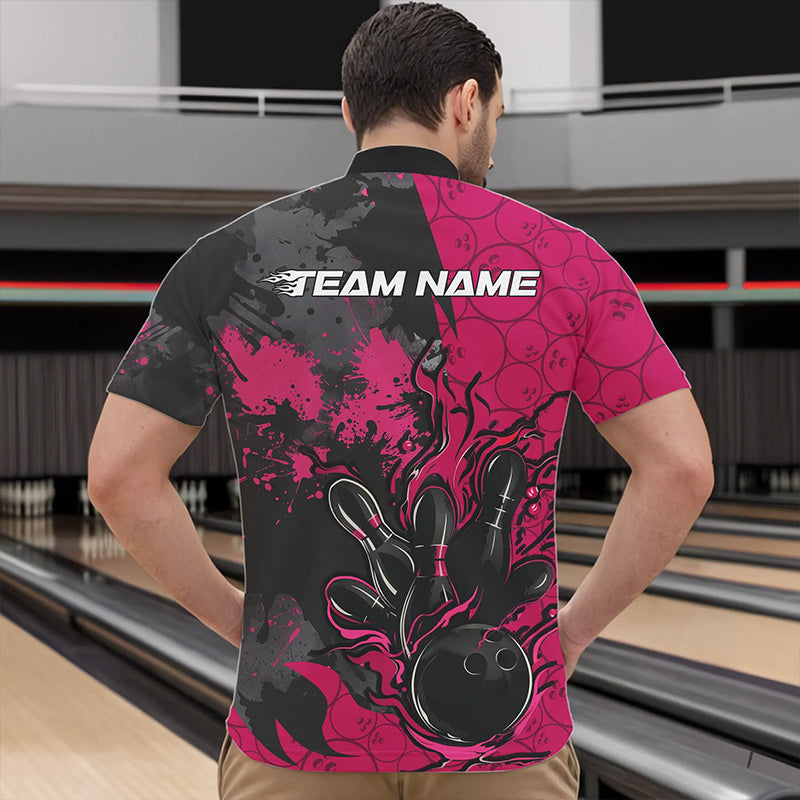 Custom Black And Pink Splatter Camo Flame Bowling Quarter-Zip Shirts For Men, Bowling Team Uniform IPHW8626