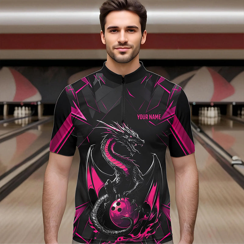 Custom Black And Pink Dragon Bowling Quarter-Zip Shirts For Men, Dragon Bowling Team Uniform IPHW8640