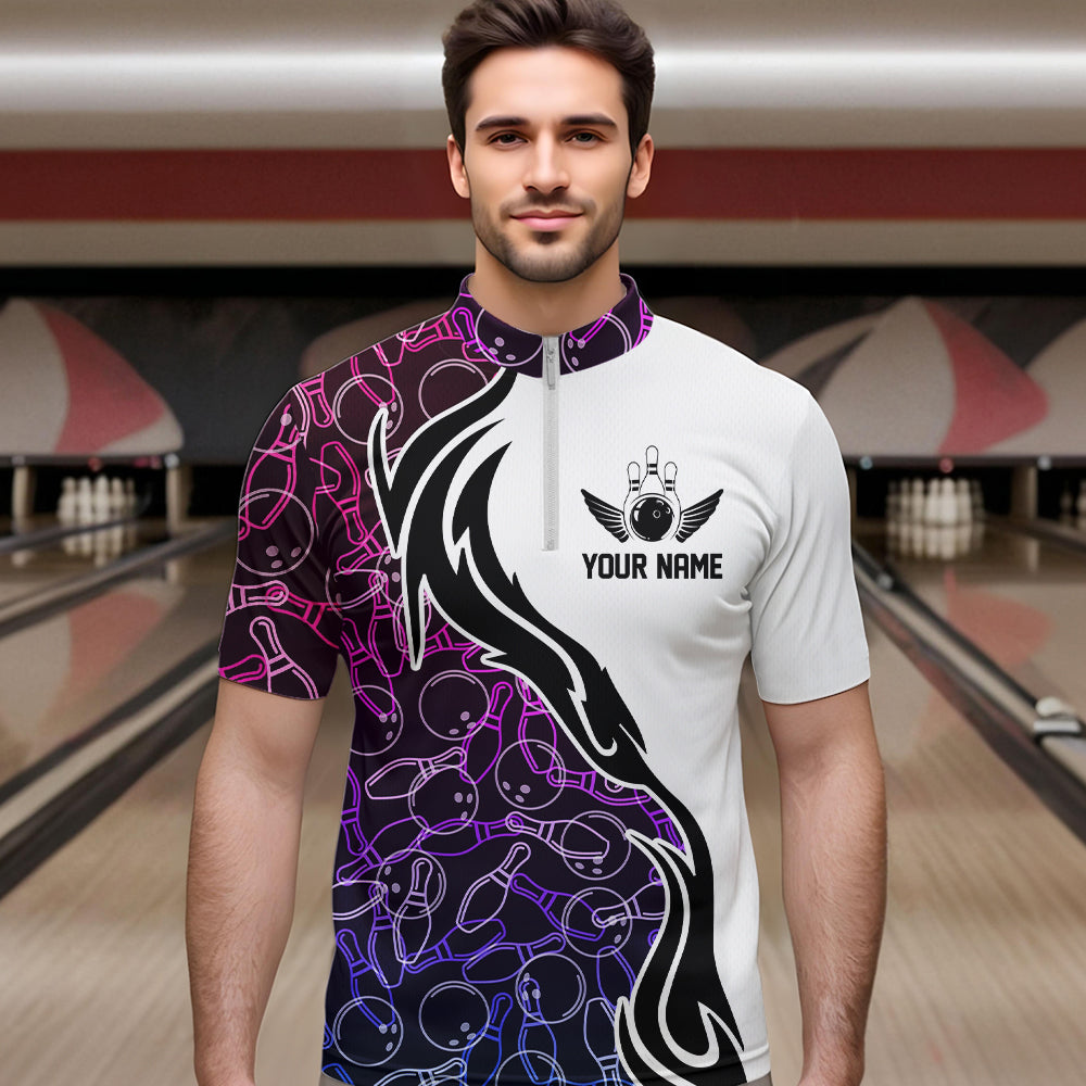 Blue Purple Pink Bowling Pattern Custom Bowling Team Men Quarter-Zip Shirts, Bowling League Shirt IPHW8869