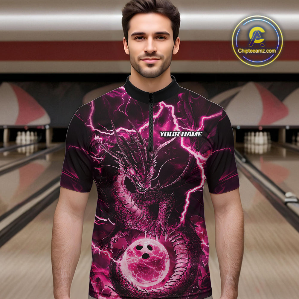 Custom Pink Thunder Lightning Dragon Bowling Quarter-Zip Shirts For Men, Team Uniform IPHW9760