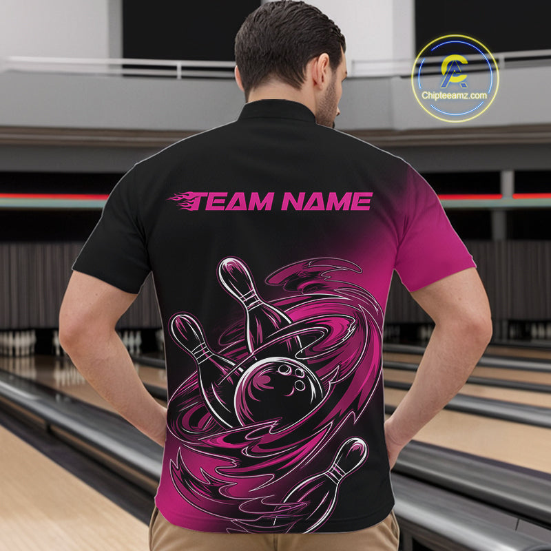 Custom Black And Pink Flame Bowling Quarter-Zip Shirts For Men, Team Bowling League Shirt IPHW9777