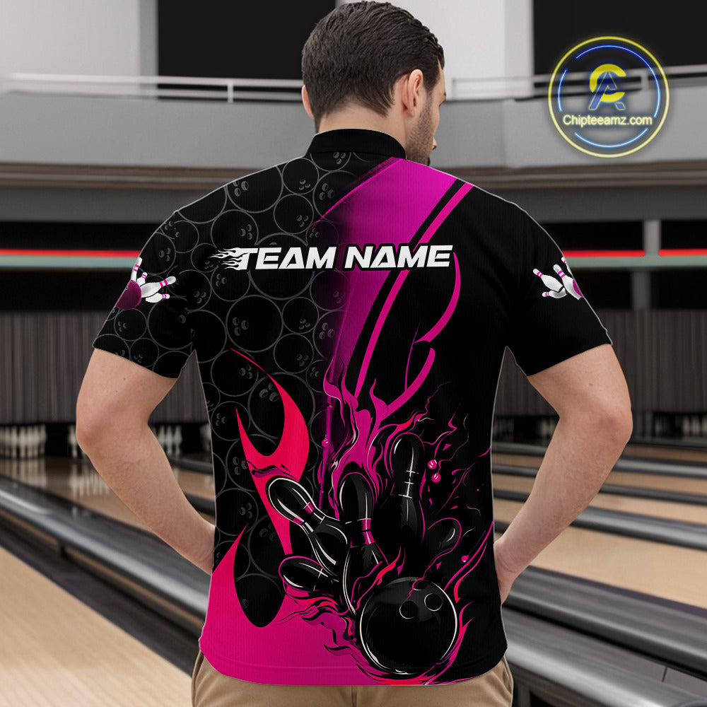 Custom Pink Flame Bowling Pattern Bowling Men Quarter-Zip Shirt, Bowling Team League Shirt IPHW9882