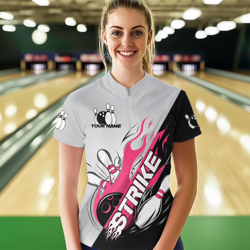 Custom Pink Flame Strike Bowling Women Quarter-Zip Shirt, Team Uniform Bowling League Shirt IPHW8778