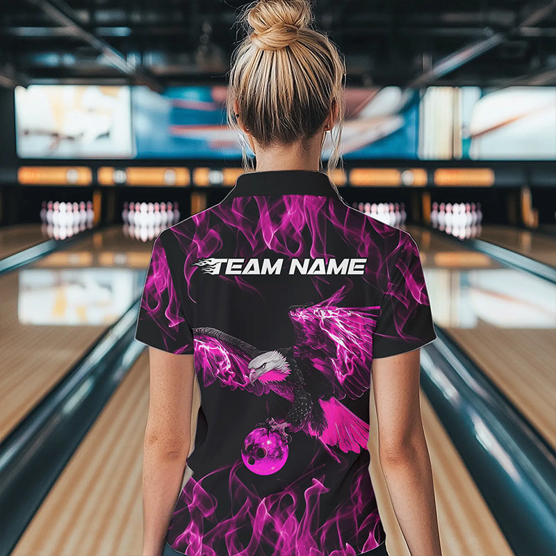 Custom Black And Pink Flame Eagle Bowling Women Quarter-Zip Shirts, Bowling League Shirt IPHW8800