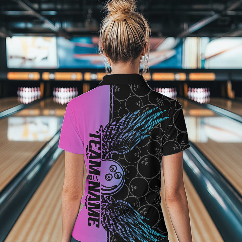 Blue And Pink Custom Bowling Tournament Women Quarter-Zip Shirts, Bowling Ball And Wings IPHW8847