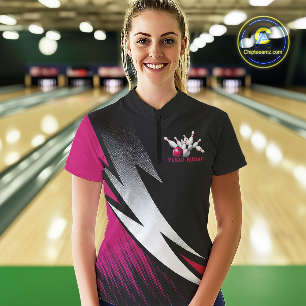 Black And Pink Custom Bowling Jerseys, Women Quarter-Zip Shirt Bowling Tournament Outfits IPHW9081