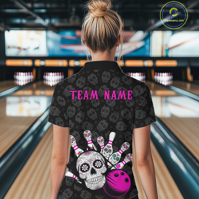 Custom Black And Pink Sugar Skull Bowling Women Quarter-Zip Shirt, Bowling League Shirt IPHW9252