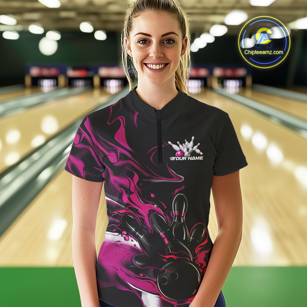 Custom Black And Pink Camo Flame Bowling Team Women Quarter-Zip Shirts, Bowling Jerseys IPHW9880