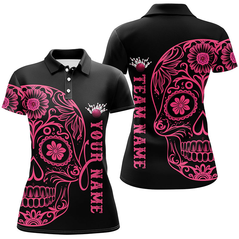 Pink Sugar Skull Tattoo Custom Ladies Team Bowling Polo Shirts, Halloween Team Bowling Jerseys IPHW6711