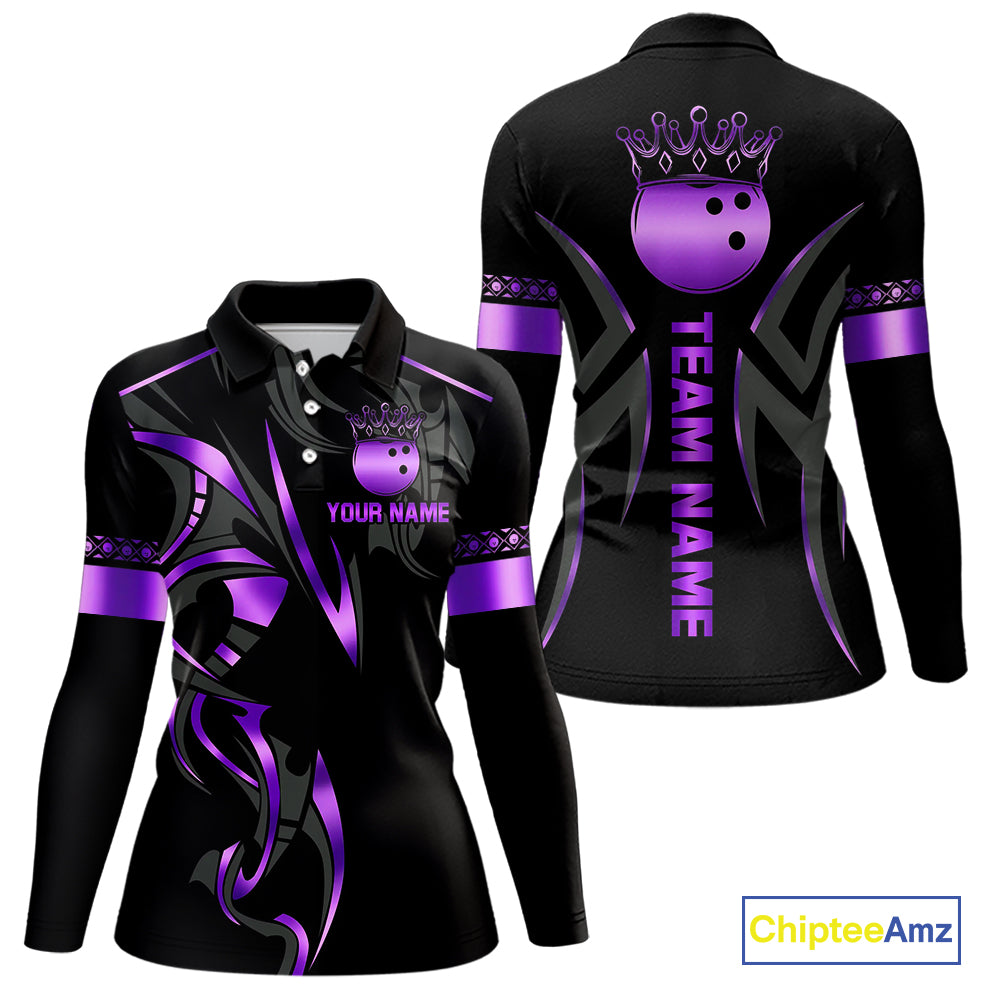 Black and Purple crown Bowling ball Polo, Quarter Zip Shirts for Women Custom Bowling Team jerseys NQS10046