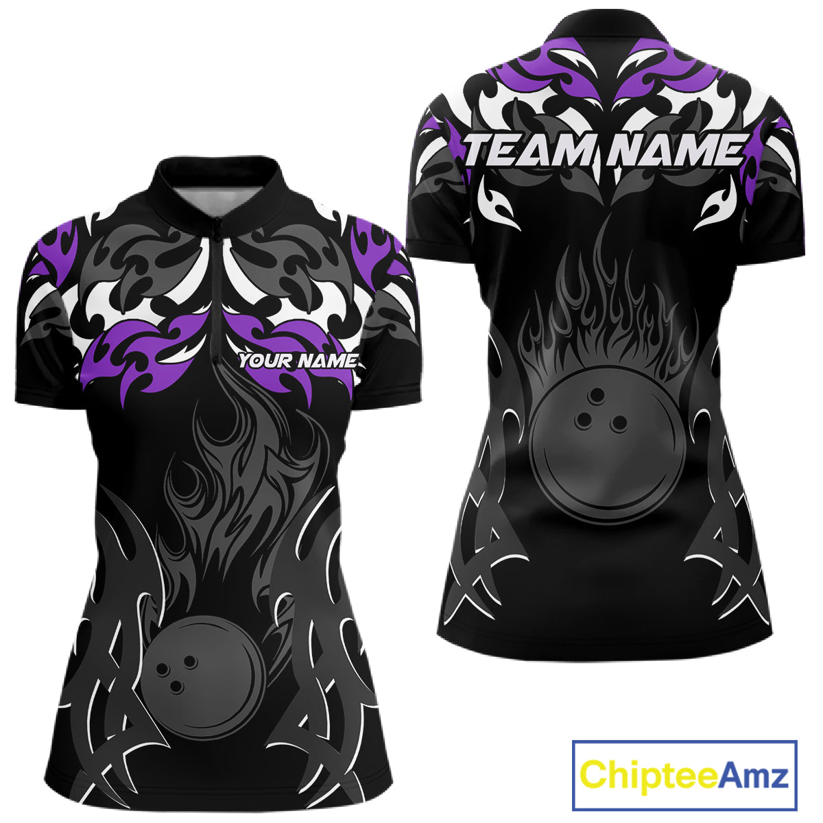 Black and Purple Flame Bowling Polo, 1/4 Zip shirt for Women Custom Team bowling jersey bowler gift NQS10535
