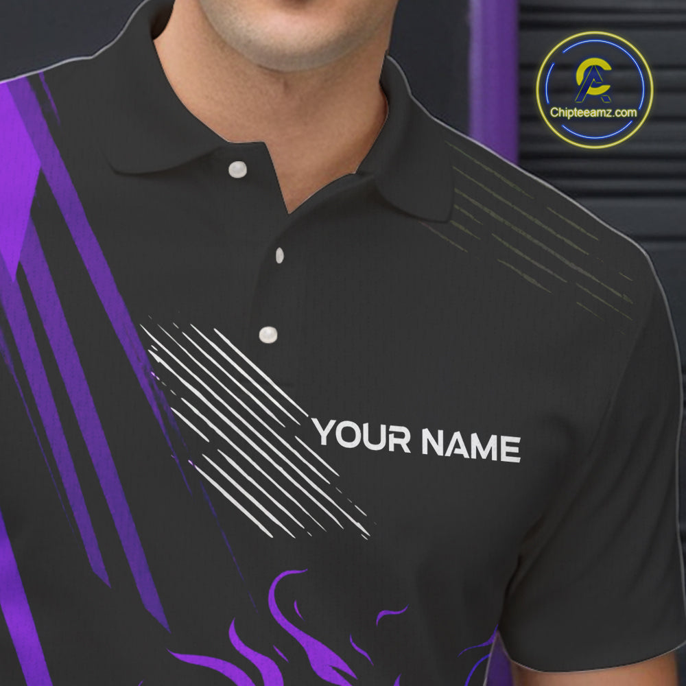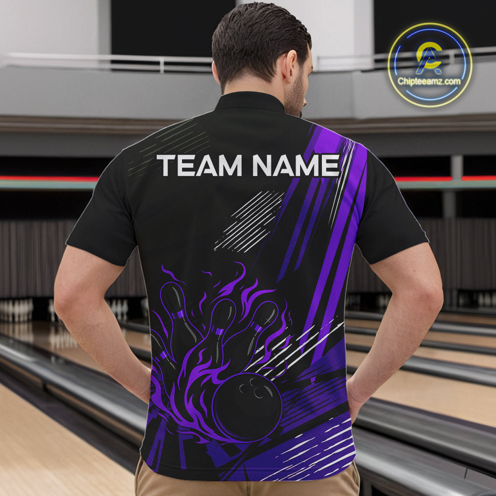 Black and Purple Flame Bowling Polo, Quarter Zip Shirts For Men Custom Bowling Outfit Team Jerseys NQS10194