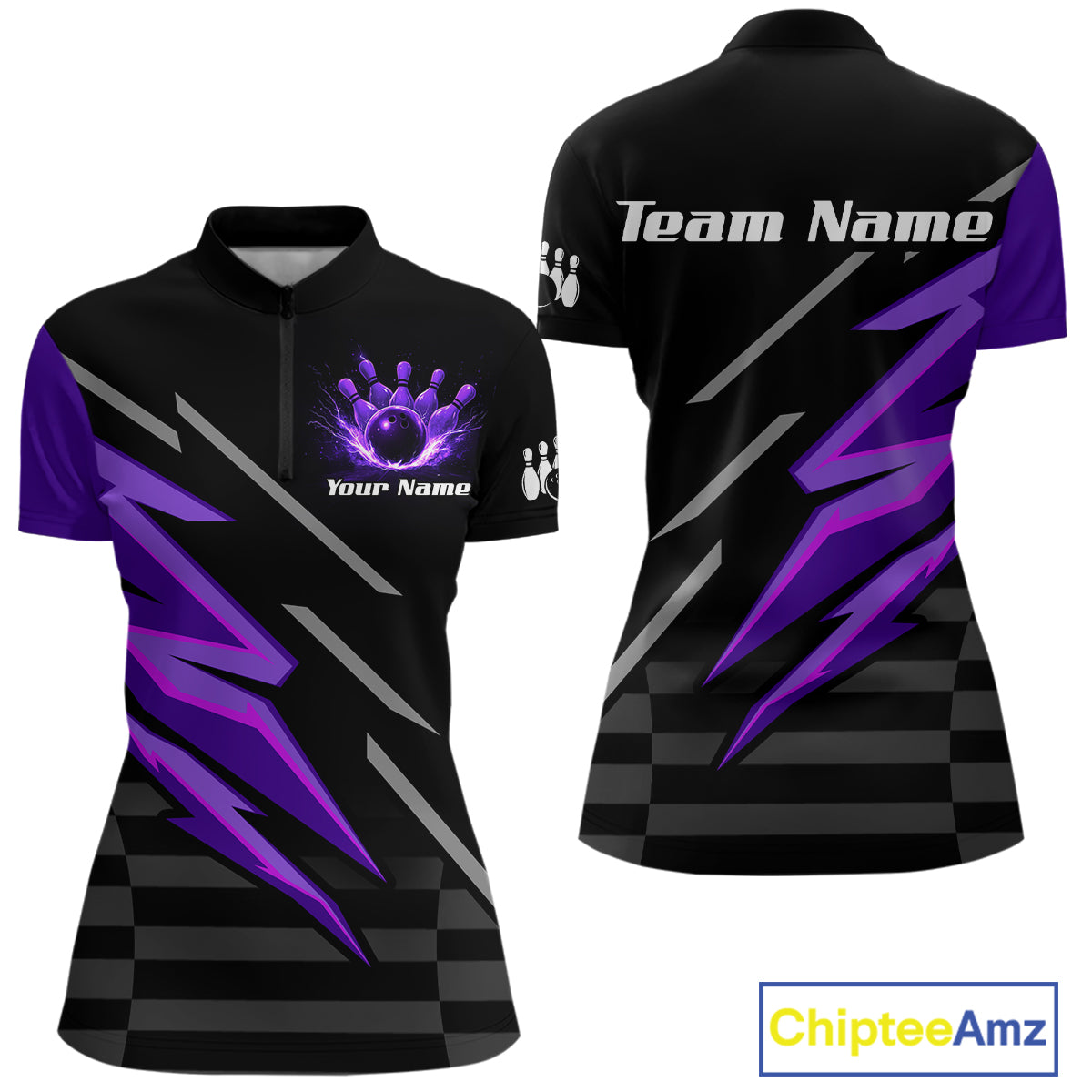 Black and Purple Lightning Bowling Polo, 1/4 Zip Shirt for Women Custom Bowling Team League Jersey NQS10907